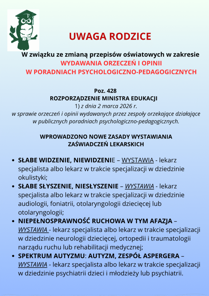 W związku ze zmianą przepisów Poradnie Psychologiczno Pedagogiczne zmieniają swoje druki dokumentów niezbędnych do wydania orzeczeń i opinii. Nowe druki dokumentów