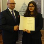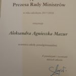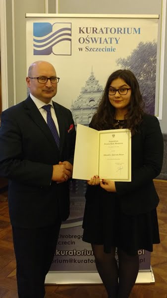 Aleksandra to szczególne wyróżnienie otrzymała z rąk Zachodniopomorskiego Wicekuratora Oświaty pana Roberta Stępienia oraz Dyrektora Delegatury Radcy Generalnego Zachodniopomorskiego Urzędu Wojewódzkiego pana Pawła Michalaka.