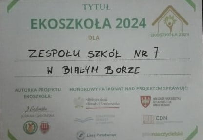 Chciałybyśmy podsumować udział naszej szkoły w IV edycji ogólnopolskiego projektu EKOSZKOŁA, który realizowany był przez cały rok szkolny 2023/2024 przez uczniów i nauczycieli Zespołu Szkół nr 7 w Białym Borze. Miło nam poinformować, iż nasza szkoła spełniła wszystkie wymagania formalne, bardzo mocno angażując się w zaplanowane ekologiczne działania otrzymując zaszczytny tytuł EKOSZKOŁA 2024.