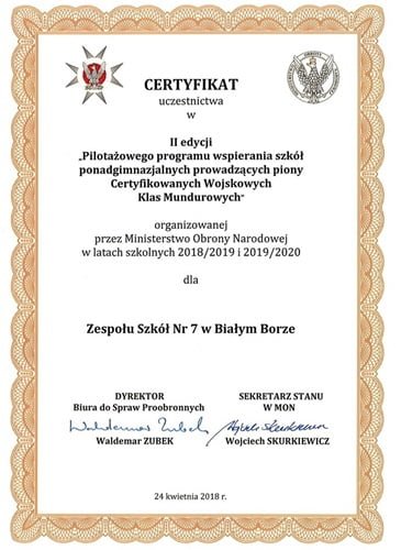 Na zakończenie Dyrektor Biura do Spraw Proobronnych – p. Waldemar Zubek, wręczył ponad 60 szkołom  certyfikaty uczestnictwa w/w programie, w tym m.in. Zespołowi Szkół Nr 7 w Białym Borze.