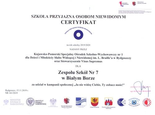 Efektem zorganizowanych przez Samorząd Szkolny warsztatów z okazji Międzynarodowego Dnia Białej  Laski jest certyfikat Szkoły Przyjaznej Osobom Niewidomym.