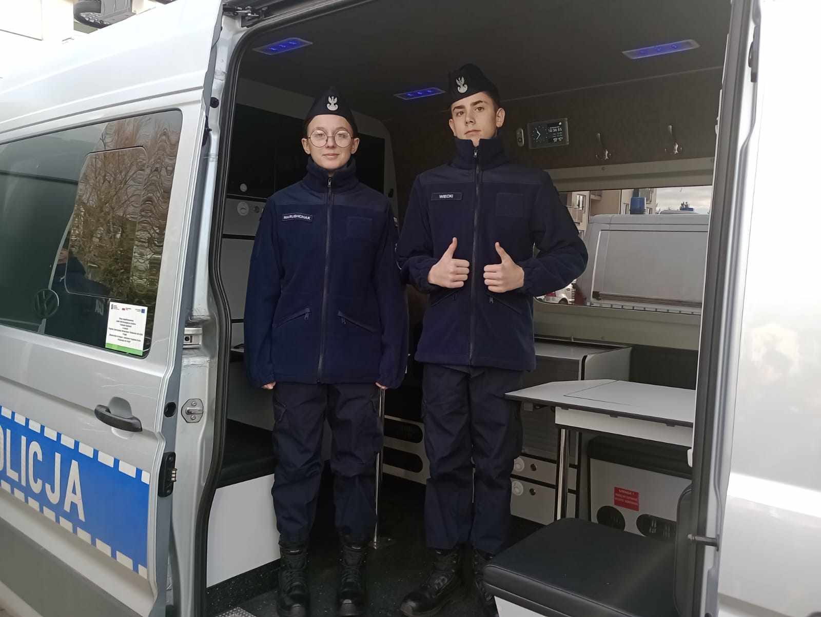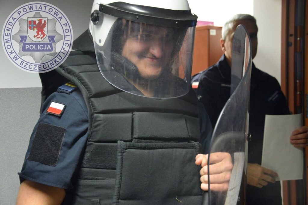 i nadzorują działania funkcjonariuszy w terenie, a także tymczasowe pomieszczenie dla osób zatrzymanych, gabinet Naczelnika Wydziału Prewencji oraz salkę do zajęć z samoobrony i siłownię. Funkcjonariusze służby więziennej oraz policjanci zaprezentowali dostępne w jednostkach jednostki broni długiej oraz sprzęt ochrony osobistej, które są wykorzystywane przez funkcjonariuszy podczas interwencji. min. do zabezpieczeń imprez masowych. O swojej ścieżce kariery zawodowej opowiadał młodzieży były policjant, obecnie pracownik prokuratury, który odpowiadał na licznie zadawane przez młodzież pytania. Zachęcał też do wstąpienia w nasze szeregi i sam przyznał,